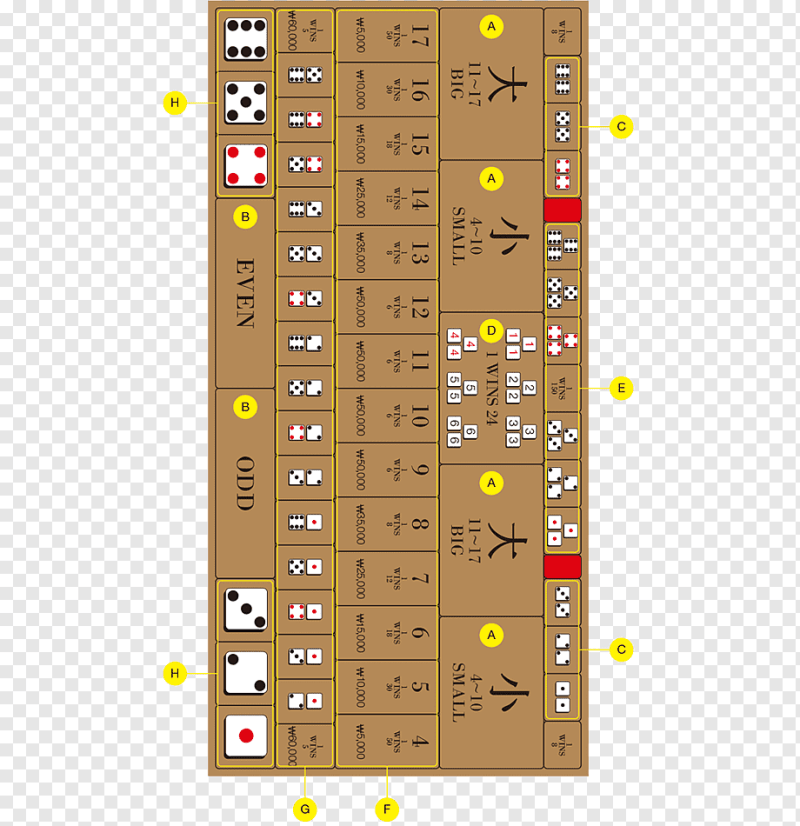 The table contains all combinations of dice and all bets available in the game; you just have to learn. The Sic Bo table is where you place all your bets and where the dealer deals chips to all the players.